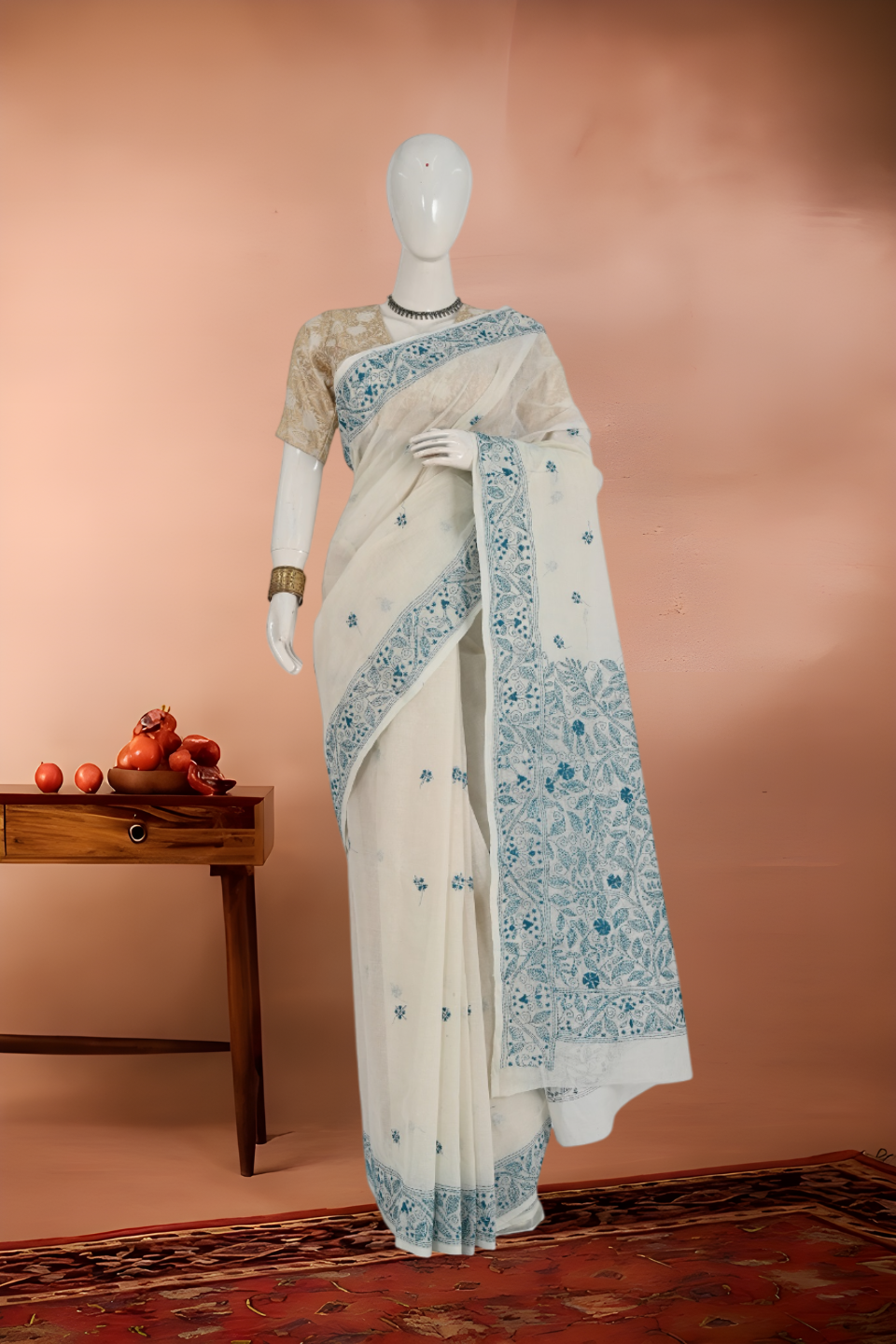A soft and breathable kantha stitch saree with an off white base with prominent blue floral and leaf patterns created through kantha stitch.