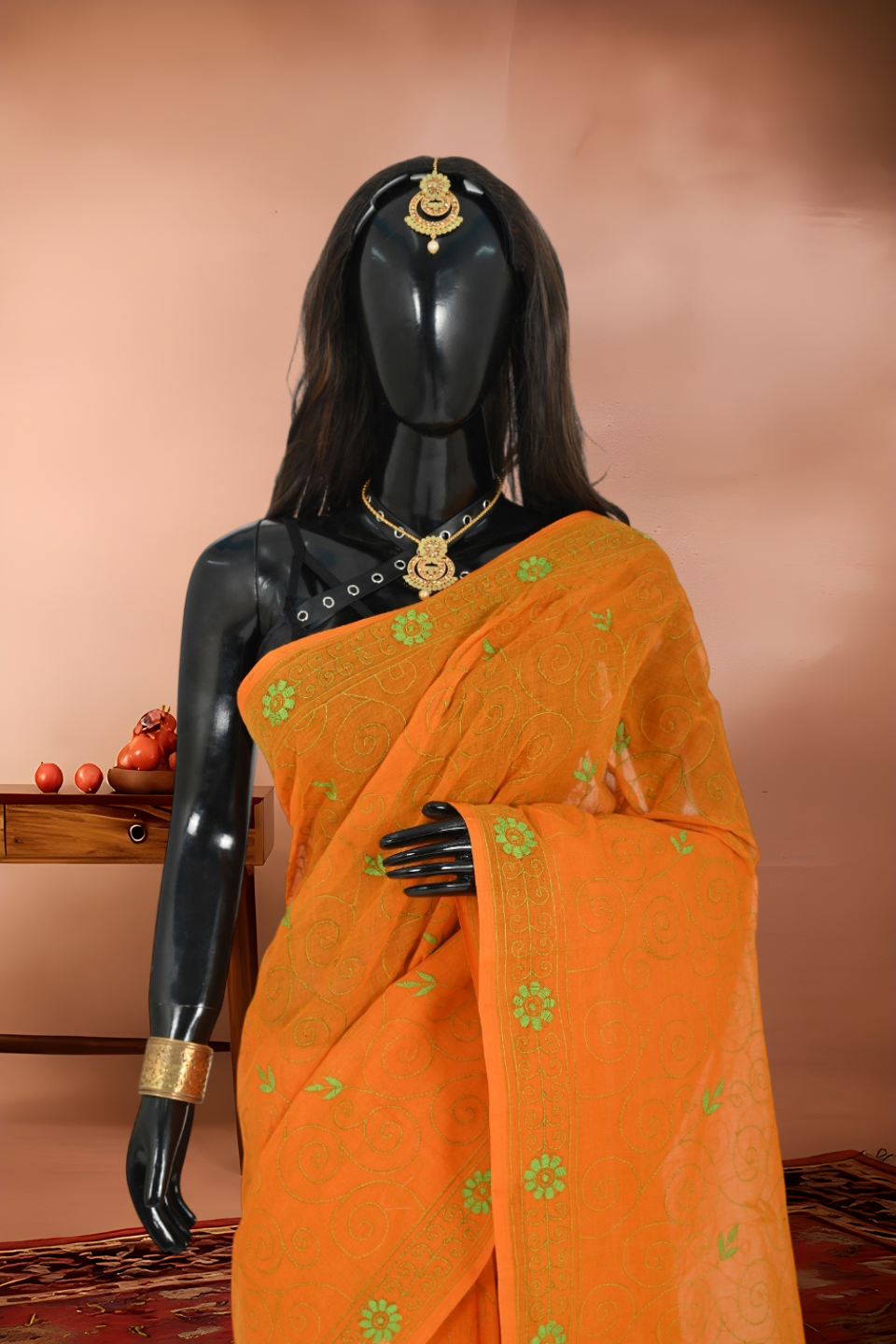 Vibrant orange colour kantha stitch pure cotton saree with green leaves and threadwork all over the saree. Breathable and easy to drape with a vibrant appeal