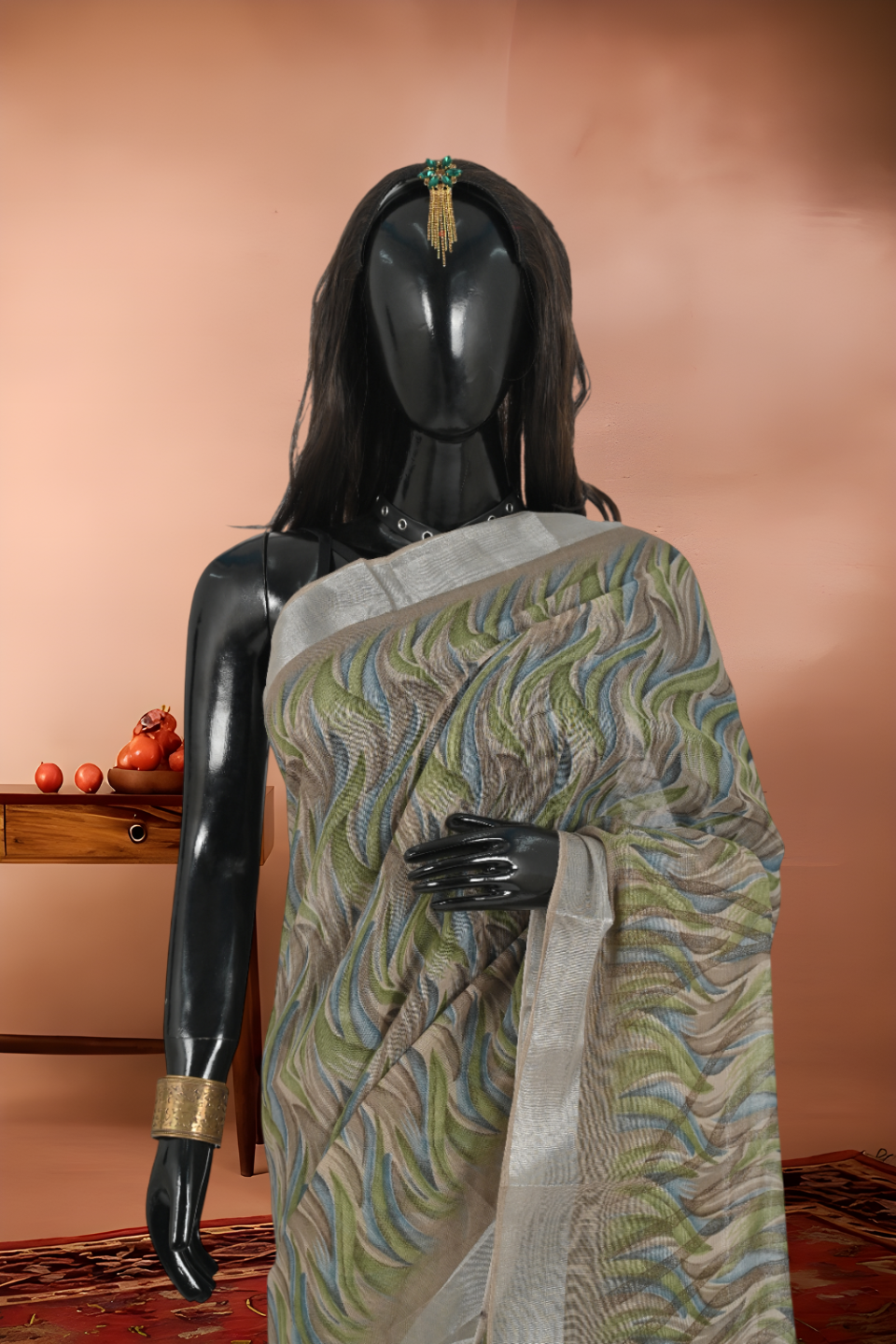Linen Cotton saree has printed leheriya or wave pattern on the saree in shades of blue, green & dull brown. Very comfortable and easy to drape suitable for office wear , small get togethers and events