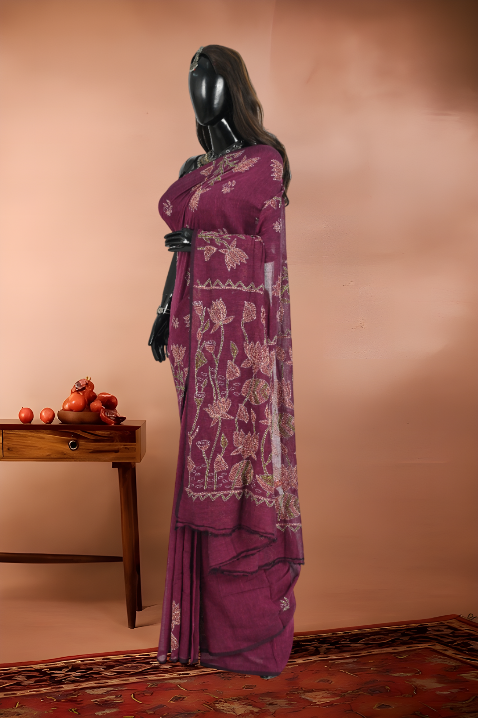 A deep maroonish purple saree with floral and leaf patterns in threads of yellow, green and white , visually very appealing , can be worn to festive events, to office and get togethers.