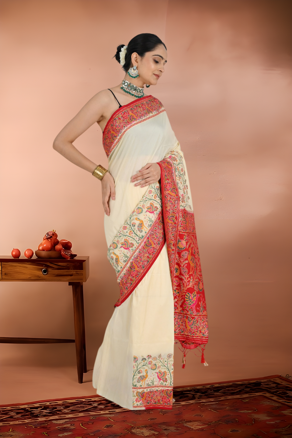 A Rajwadi Pashmina Baluchari Silk Saree in cream and red colour, the saree showcases vibrant and colourful motifs including peacock design and floral patterns prominent on the pallu and borders. This saree is a royal aesthetic suitable for festivities and traditional events. A MUST BUY!