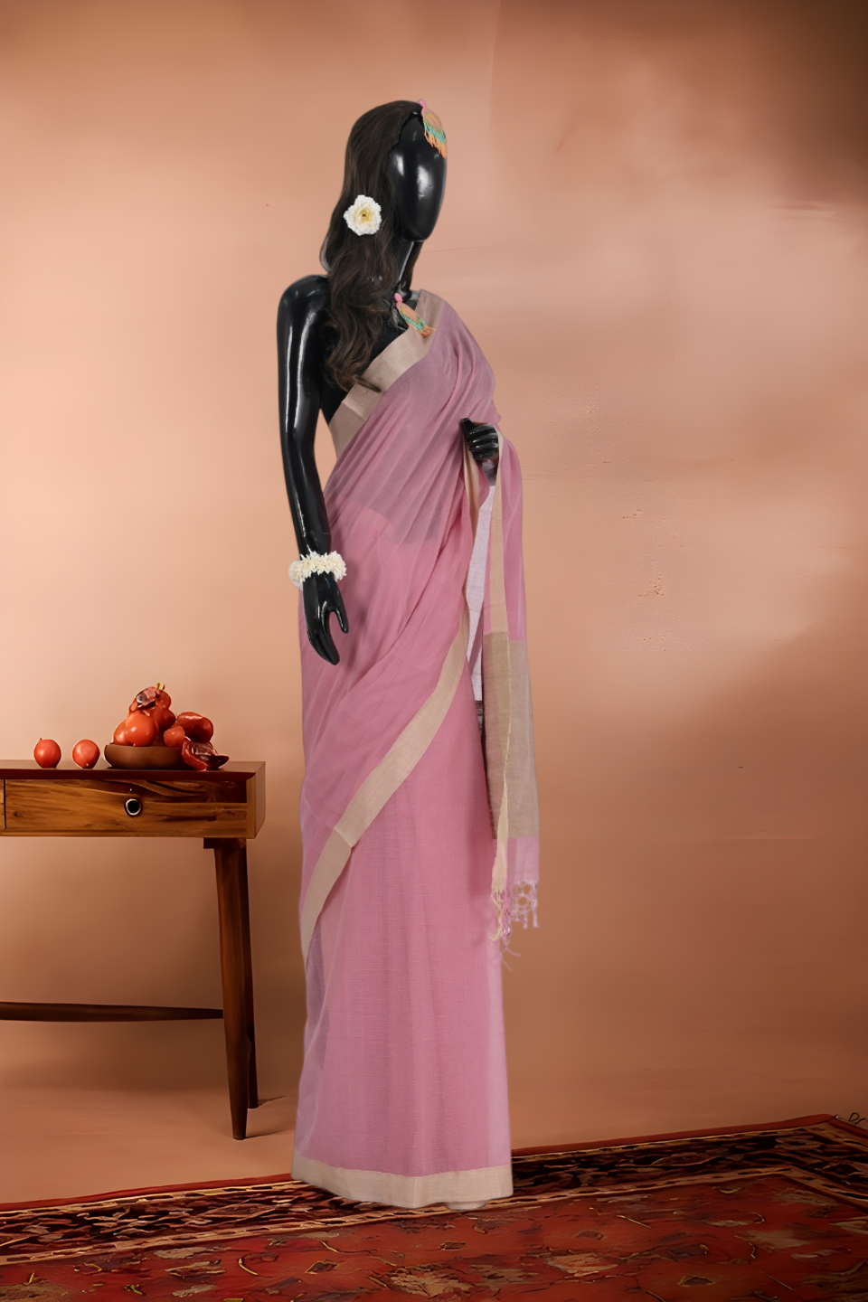 Kora silk pure cotton saree known for its breathability and comfort, suitable for various climates and daily wear. The saree is a shade of pink with a champagne gold border offering a feminine and elegant aesthetic. Cotton saree are versatile and can be worn for daily activities, casual outings or even festive occasions.
